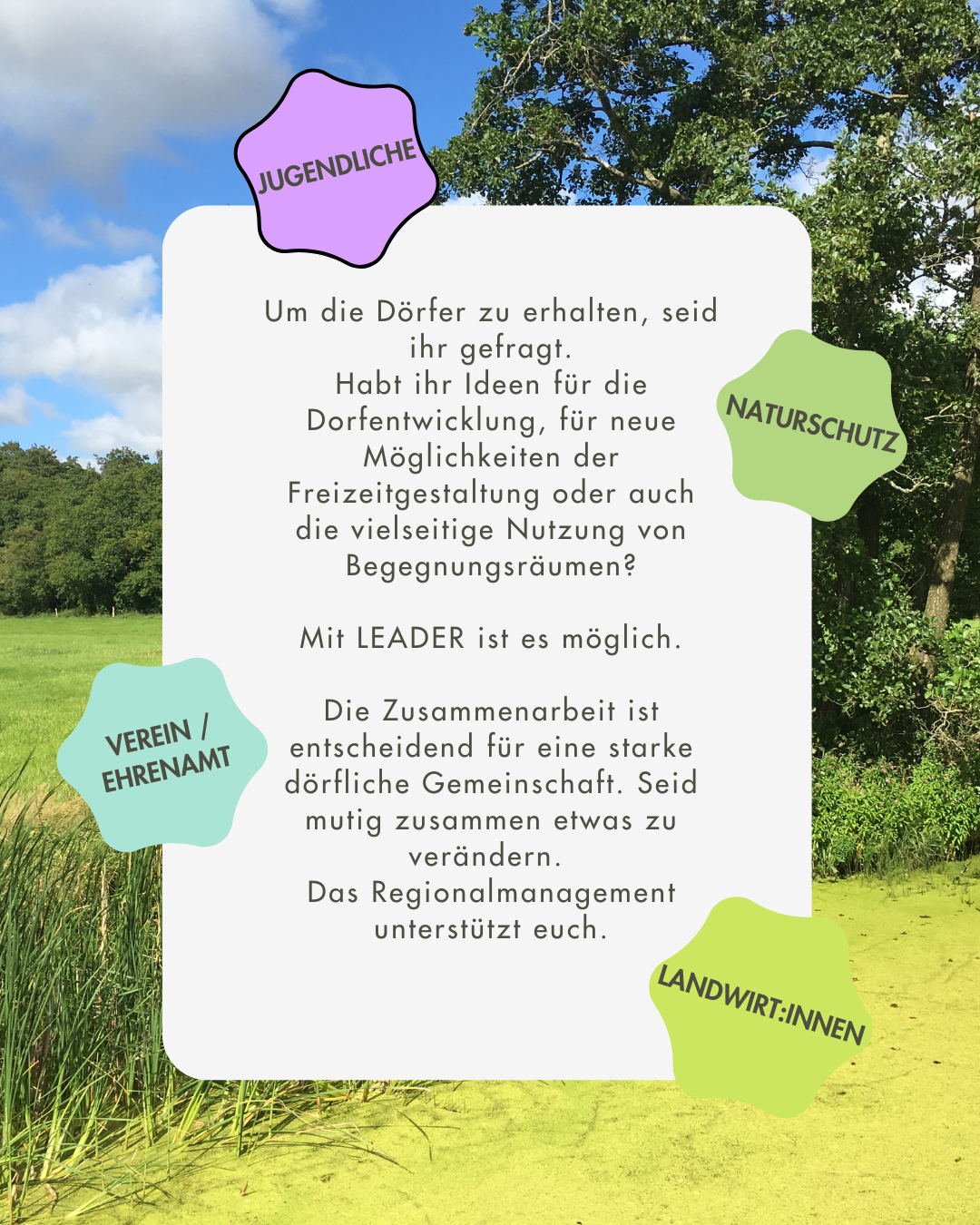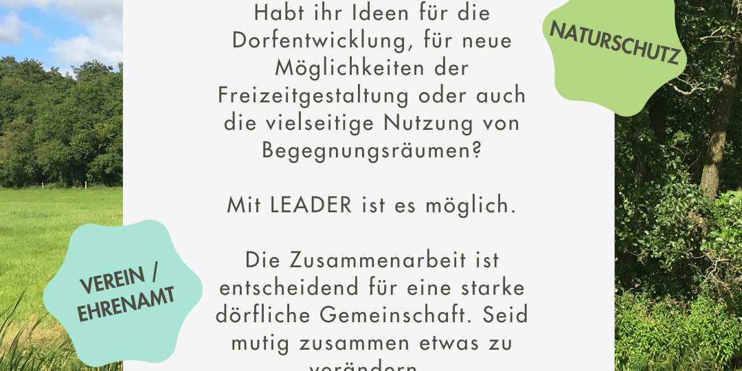 Sie haben eine Idee für ein Projekt in unserer Region? Insgesamt können 50 – 80 % der Nettogesamtkosten eines Projekts gefördert werden. Die Mindesthöhe beträgt für private Antragsteller:innen 2.500 €, der Höchstbetrag liegt bei 150.000 €. Der LEADER-Betrag wird zudem mit öffentlichen Mitteln zu 25 % kofinanziert. Bei einem kleinen Projekt in Höhe von 5.000 € läge die gesamte Förderung bei 3.750 €. Wichtig ist, dass Sie mit Ihrem Projekt einen Beitrag zu den regionalen Entwicklungszielen der LEADER-Region leisten.