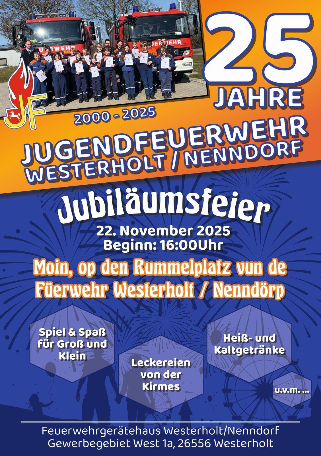 Die Jugendfeuerwehr Westerholt/Nenndorf lädt herzlich zur Jubiläumsfeier anlässlich ihres 25-jährigen Bestehens am 22. November 2025 ein.
